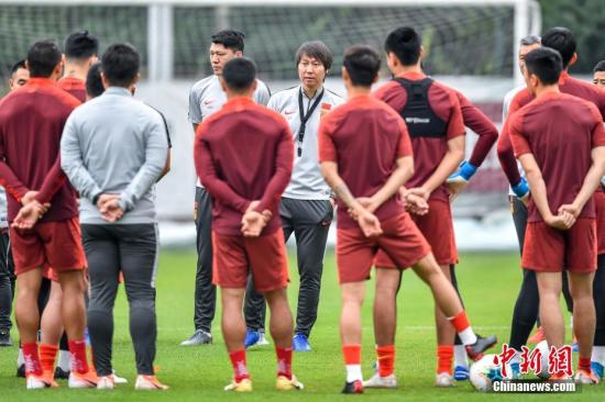 资料图::中国国家男子足球队主教练李铁在训练场上与队员交谈。中新社记者 陈骥旻 摄